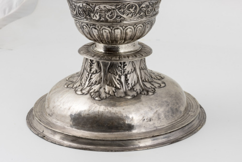 Base in argento formata da due elementi a disco sovrapposti e da un elemento a profilo sinuoso sovrastante, decorato nella metà superiore da foglie a sbalzo. Il fusto è composto da una parte a campana rovesciata, decorata a sbalzo da un motivo a bacellature e da una fascia superiore dove corrono dei girali fitomorfici; è raccordata alla porzione in cristallo di rocca da un elemento a rocchetto ornato da motivi rettangolari lisci incorniciati. Il piattello ha una forma espansa, con labbro a tesa rovesciata, decorato a bacellature