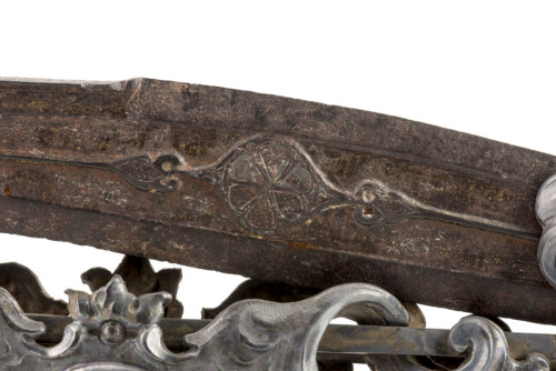 - NOTIZIE STORICO CRITICHE Questo oggetto è di difficile inquadramento. Potrebbe essere di produzione siriana ma anche occidentale, ambito nel quale venne comunque inserita la lamina d'oro tra lama e manico. I caratteri nashki appaiono ispirati a forma arabe ed alcuni sono capovolti, ma non risultano comunque interpretabili. Si riteneva fosse il coltello con cui San Pietro aveva troncato l'orecchio di Malco, ma anche, secondo un'altra versione, come il coltello usato nell'Ultima Cena. Entrò nel Tesoro dopo il 1609, quando era ancora in deposito presso i Padri Cappuccini, e prima del 1620. Si tratta presumibilmente dello stesso coltello pervenuto alla chiesa di San Pietro di Castello a Venezia nel 1559, grazie al lascito fatto da Alessandro Foscari, del ramo di San Simeon piccolo, nel suo testamento del 1544