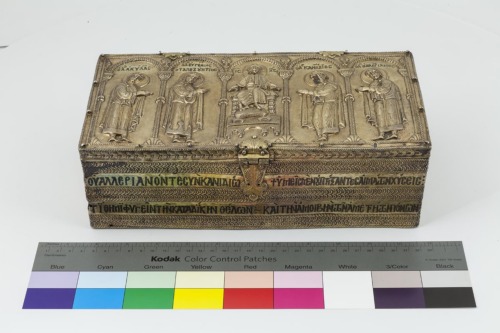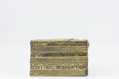 - NOTIZIE STORICO CRITICHE E' probabile che l'oggetto provenga da Trebisonda, come le reliquie che doveva contenere. Forse fu donato a Venezia (presumibilmente prima della caduta della città nel 1461) dal cardinale Bessarione, originario di Trebisonda, o da una famiglia della città trasferitasi a Creta agli inizi del XV secolo. L'iscrizione sui fianchi è composta da dodici trimetri giambici: ogni verso è separato da tre punti verticali