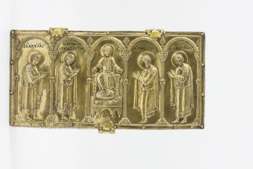 - ISCRIZIONI sopra la testa dei Santi - O AΓ AKYΛAC O AΓ EYΓENIOC O TPAΠEZOYNTIOC O AΓ KANIΔIOC O AΓ OYAΛEPIANOC - maiuscoli - a niellatura - greco