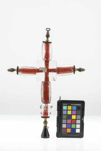 Croce con montatura di bronzo, costituita da sette elementi in cristallo di rocca molati e lisci, con foro passante. Al centro si colloca un elemento quadrato e lungo i bracci altri quattro elementi, due laterali che presentano delle sfaccettature a sei lati, gli altri due subcilindrici. Nel braccio inferiore si trovano due ulteriori elementi terminali ad anello