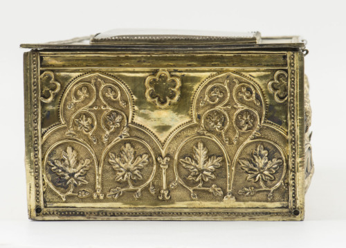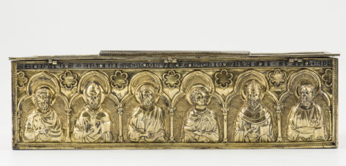 Scatola rettangolare in argento dorato, con coperchio piatto munito di tassello centrale rettangolare in cristallo di rocca, contornato da iscrizioni a niello. Sui fianchi, lungo i due lati maggiori, entro archi trilobati retti da colonnine liscie con capitelli a foglie, sono collocati i busti di dodici santi su fondo puntinato (sei per lato), identificati dalle iscrizioni posizionate nella fascia che corre sotto il coperchio. Tra gli archi superiormente sono collocati medaglioni esalobati con profilo a rilevo. Sui lati minori vi sono due pannelli con spirali e girali terminanti a foglie e frutti, inscritti entro archi trilobati su fondo puntinato, con medaglioni esalobati nella parte superiore, uno intero centrale e due divisi a metà