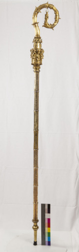 Asta ottagonale composta da otto pezzi su anima in legno, con terminazione in puntale liscio. In ogni segmento le facce verticali sono incise a motivi vegetali su un fondo di intagli incrociati, alternate a facce traforate sostenute da placchette d'argento non dorato decorate a graticcio. Nodo aggettante a sei lati suddiviso in tre zone: in quella inferiore serie di putti alati alternati ad elementi a quattro foglie appuntite, in quella centrale otto nicchie architettoniche con figure in piedi, vestite di armatura, sotto un baldacchino ad arco che ne nasconde la testa, la terza con altre figure in piedi con armatura sotto archi cuspidati. Il manico a riccio è costituito da segmenti a sbalzo congiunti a coda di rondine, sagomati a foglie, terminanti in una statuina a tutto tondo rappresentante San Marco
