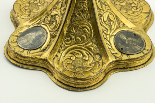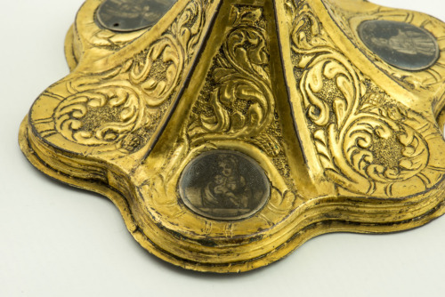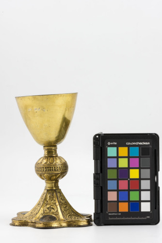 Piede esalobato in rame dorato con zoccolo piatto. Decorato con tralci a sbalzo su sfondo punzonato e tre medaglioni circolari a niello, uno con la Madonna con Bambino e gli altri con due Santi. Nodo emisferico leggermente depresso con bacellature ai due lati e fascia centrale a dentelli, affiancato da due elementi esagonali lisci. Coppa campaniforme priva di decorazione