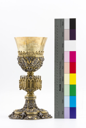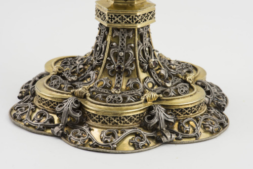 Piede esalobato con bordo inclinato e zoccolo piatto a ringhiera traforata a disegno gotico. Bordo e piede sono decorati da tralci vegetali in argento fusi in rilievo su fondo dorato. Al centro di ogni settore lobato vi è una fascetta verticale con pietre incastonate (ametiste, topazi, turchesi e almandine) e gemme vitree in alte montature a castone. Nodo esagonale aggettante, fuso, a struttura architettonica ordinata in dodici nicchie ogivali accoppiate. Coppa campaniforme, decorata nella metà inferiore da medaglioni circolari in rilevo, che inscrivono motivi rilevati a fiore in argento, circondati da elementi vegetali sempre in argento. Una fascetta con gigli seriali corona la parte superiore