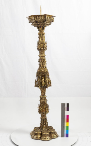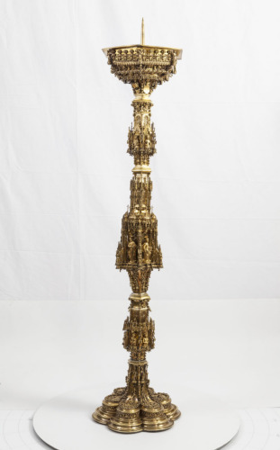 - NOTIZIE STORICO CRITICHE E' in coppia con un altro candeliere del tutto analogo, differente solo nel particolare del nodo superiore in cui vi è Cristo in croce al posto di una santa, e che la Trinità nel nodo più basso non ha la croce. La fascetta con animali fantastici sul piede è stata realizzata con il medesimo stampo del Reliquiario di S. Isidoro, conservato nel Santuario (Santuario 111). E' costituito da quattro parti avvitate tra loro