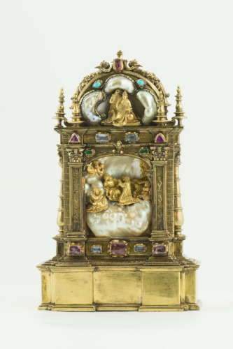 Alto zoccolo liscio; edicola delimitata in basso da fascia con pietre incastonate, ai lati da due pilastrini con decori geometrizzanti e capitelli a foglie e volute su fondo con motivo a mattoni; architrave con pietre preziose incastonate, due triangolari e due rettangolari. Al centro si trova la scena di Cristo nell'Orto di Getsemani con elementi in madreperla e piccolo angelo sulla chiave di volta tra due pietre preziose. Coronamento ad arco con rappresentazione di Dio Padre benedicente tra nuvole di madreperla e pietre incastonate, con ai lati piccole cuspidi a balaustro. Addossate sui fianchi vi sono due semicolonne a balaustro. Sul retro, nel timpano vi è la raffigurazione della Resurrezione di Cristo e al centro ornamenti a tralci vegetali con putti e grottesche