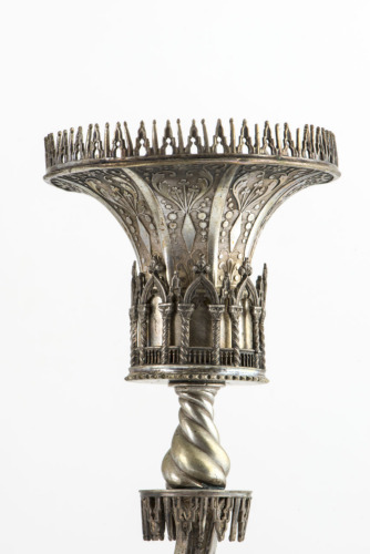 Piede circolare piatto, con zoccolo decorato da bugnature a punta di diamante. Piedistallo cilindrico, decorato a traforo da due serie di archi che imitano quelli di Palazzo Ducale, sorretto da quattro piedi a zampa di animale. Il fusto ha forma conica a sezione ottagonale, ed è decorato da un'altra doppia serie di archi gotici nella parte inferiore. I cinque bracci partono da un elemento di raccordo cilindrico, anch'esso decorato ad arcate gotiche; quattro di essi sono ricurvi, nel primo tratto tortili e nel secondo decorati a motivi floreali stilizzati. Il quinto braccio, posto al centro, è verticale con forma a bulbo ritorto a spirale. I bracci terminano tutti alla stessa altezza, e presentano un motivo ad archi ogivali posto alla base delle coppe, a cono svasato rovesciato, terminanti in un coronamento a merlature che riprende quelle di Palazzo Ducale