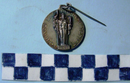 Di forma circolare. Sul recto, al centro, in rilievo elmo Adrian sovrapposto a daga. Iscrizione sull'impugnatura e lungo la corona. Sul verso, figura femminile allegorica della Fortezza su piedistallo. Iscrizione lungo la corona e sul piedistallo. Spillo all'appiccagnolo.