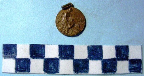 Di forma circolare. Sul recto, al centro, in rilievo figura allegorica femminile nell'atto di soccorrere un ferito. In secondo piano scena di una battaglia tra reparti di cavalleria. Sul verso, parte superiore, entro tondo croce smaltata in rosso in campo bianco. Iscrizioni al centro e lungo la corona. Anello all'appiccagnolo.