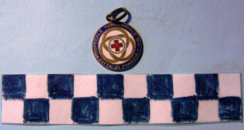 Di forma circolare. Sul recto, al centro, in campo bianco una croce greca di colore rosso in tondo entro tre cerchi dorati intrecciati. Iscrizione in oro su fondo azzurro lungo la corona. Sul verso, decorazioni in rilievo composte da due cerchi chiusi in basso da nodo Savoia e da tre cerchi intrecciati, di piccole dimensioni sulla sommità. Anello all'appiccagnolo.