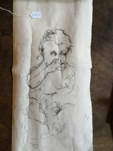 disegno a carboncino e matita realizzato sul retro di un manifesto di recupero