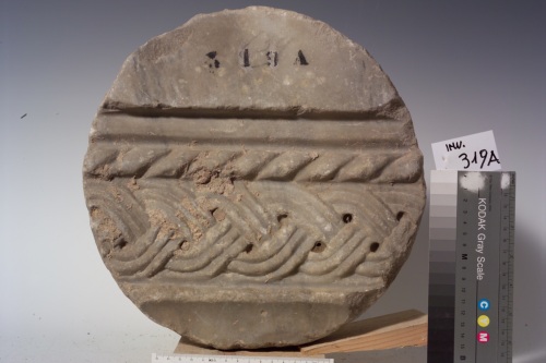 una lastra con decorazione medioevale è stata tagliata in età moderna per ricavarne un tondo sul cui retro è stata incisa un'iscrizione con lettere greche. Al di sopra di un listello è rappresentata una treccia a tre capi di nastro bisolcato e con fori di trapano all'interno della trama. In successione si hanno poi un motivo a torciglione e due solchi di cui uno più profondo.