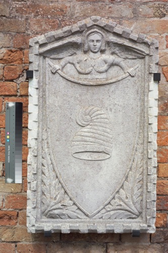 Bassorilievo in pietra d'Istria raffigurante, entro una cornice a dentelli, lo stemma Tiepolo sorretto da una figura alata e poggiante su due rami di alloro speculari.