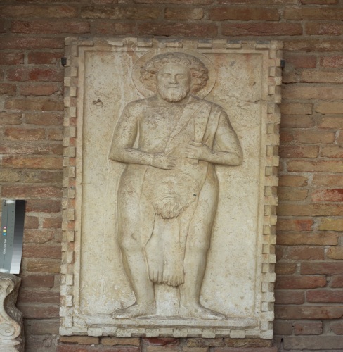 Bassorilievo in pietra d'Istria contornato da un listello piano e da una cornice a dentelli raffigurante S. Bartolomeo aureolato che sopporta sulla spalla destra la sua pelle.