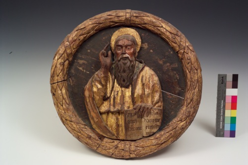 Altorilievo ligneo policromo e dorato raffigurante Cristo benedicente con libro aperto entro clipeo; la figura racchiusa in una cornice costituita da ghirlanda tonda con foglie di lauro.