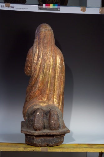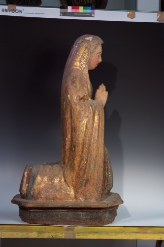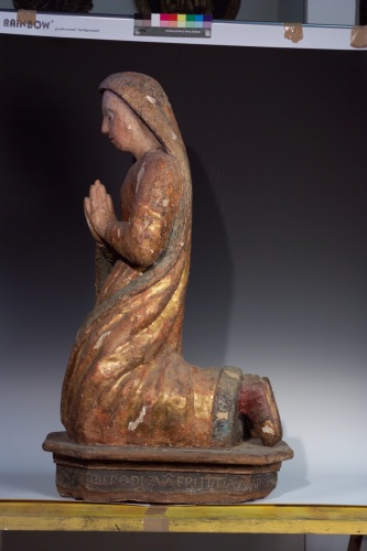 Scultura lignea dorata e policroma rappresentante una figura femminile orante con panneggio, che poggia su una base lignea dotata di iscrizione sul lato sinistro, che comproverebbe la sua funzione di opera devozionale. Si tratta di una Annunciata.