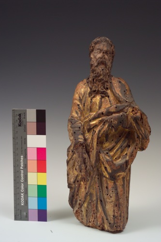 Scultura lignea dorata raffigurante una figura maschile con barba, avvolta in un manto che forma un'ampia conca intorno al corpo, privo della parte inferiore. Si tratta, forse, di un santo.