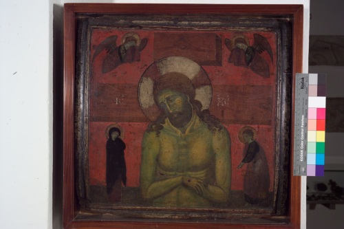 Al centro della scena vi è la figura del Cristo sofferente a braccia conserte e dietro di lui vi è la croce che ripartisce lo spazio della tavola in quattro zone, ove sono collocate le figure di due Angeli (in alto a destra e sinistra), la Vergine (in basso a sinistra) e San Giovanni (in basso a destra).