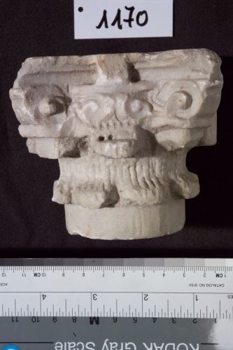 piccolo capitello pseudocorinzio probabilmente da impiegare in un tabernacolo o in altro oggetto. Sul lato finito presenta una particolare decorazione a cartoccio sotto il fiore dell'abaco. Presenta due fori circolari sulle facce dell'abaco e su quella inferiore.