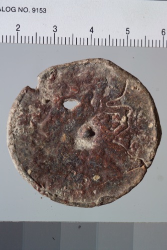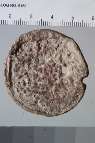 Bolla plumbea inscritta su uno dei due lati, anche se l'usura rende illeggibile sia l'iscrizione che la raffigurazione poste sul recto e sul verso del manufatto.