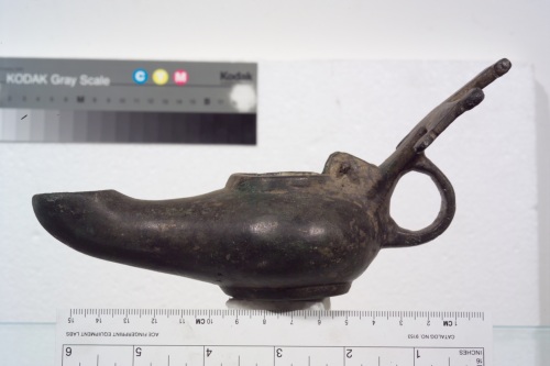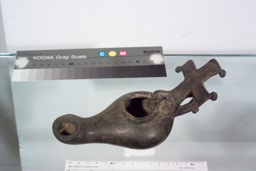 Lucerna in bronzo, priva di coperchio, con impugnatura a forma di croce con estremità ornate da bisanti.