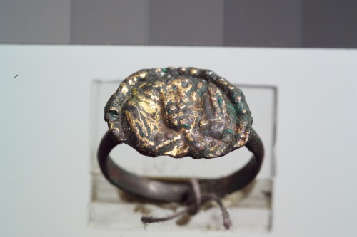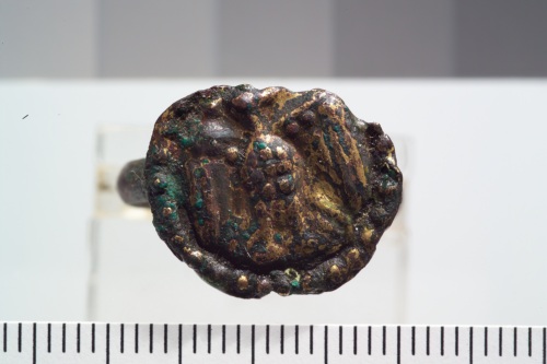 Anello in bronzo dorato sormontato da placchetta circolare con la figurazione di un'aquila a rilievo in posizione frontale.
