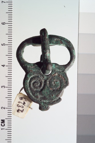 fibbia con placchetta circolare decorata ad incisione con volute.