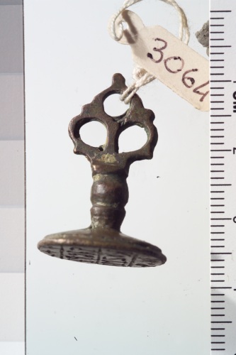 Sigillo bronzeo iscritto di forma ovale integro anche nella parte dell'impugnatura lavorata a traforo.