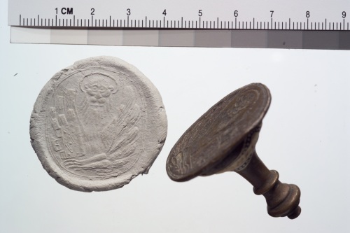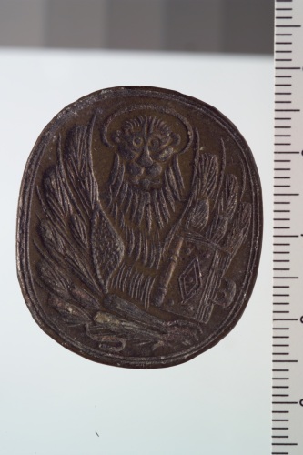 sigillo in bronzo con leone marciano e impugnatura.