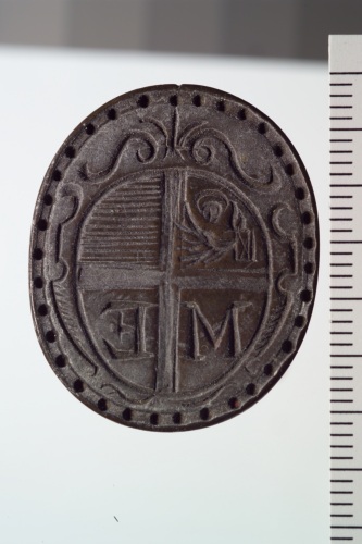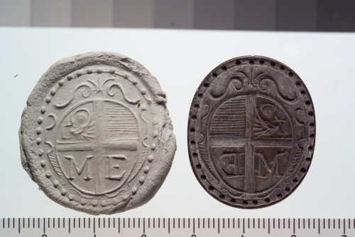 sigillo in bronzo con stemma inquadrato con leone marciano (a sinistra), nei quarti inferiori le lettere M ed E.