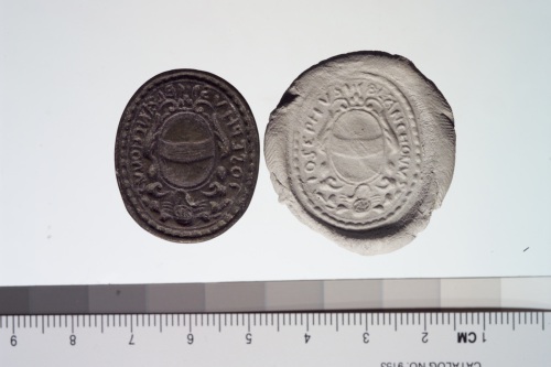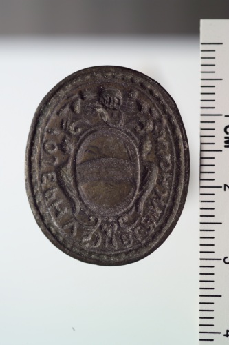 sigillo in bronzo con iscrizione che corre lungo il bordo di uno stemma di famiglia.
