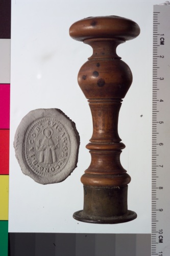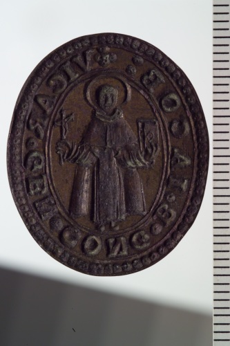 sigillo in bronzo con iscrizione e al centro figura di San Giacomo.