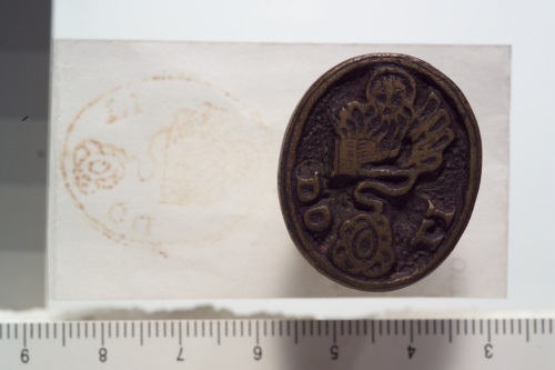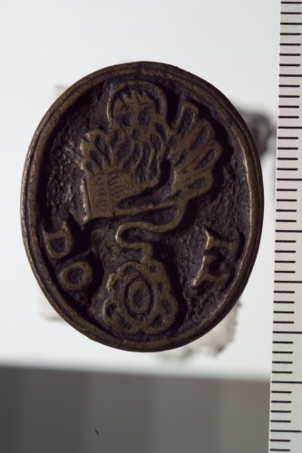 sigillo in bronzo con leone marciano e iscrizione.