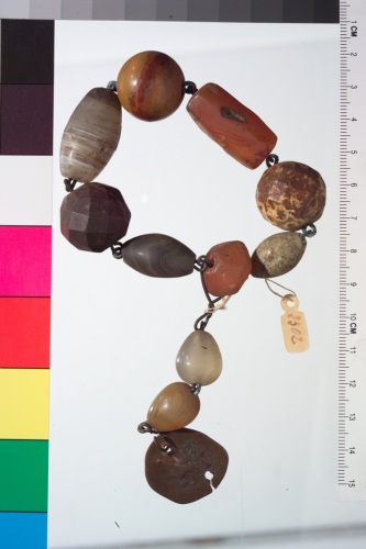Bracciale lavorato a mano con moneta in rame argentato, onice, ambra ed adamantite. La legatura delle pietre è probabilmente stata rifatta e questo genera problemi per la possibile datazione del manufatto. La moneta è datata, per comparazione con monete degli ultimi Comneni e di Isacco Angelo, al VII sec.