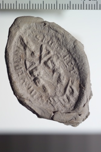 sigillo in bronzo a mandorla, con Cristo e Maria seduti e sotto, santo inginocchiato. Legenda indecifrabile.