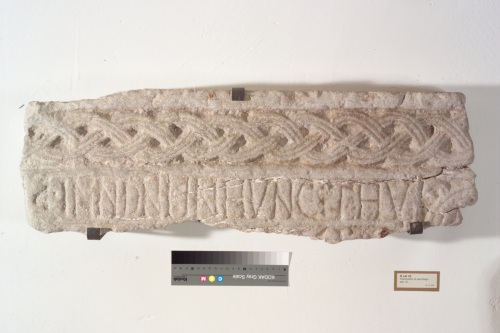 - NOTIZIE STORICO CRITICHE la treccia non costituisce elemento utile per una datazione precisa. L'accostamento tra un motivo ad intreccio ed un'iscrizione è frequente. Spesso si ritrova in cibori (più spesso con gattoni) come nel frammento della Pieve di San Martino di Sedegliano, anche se l'intreccio è molto differente. La treccia è invece simile a quella di alcuni frammenti del lapidario di Sant'Eufemia di Grado in cui la trama è allentata e fluente.
