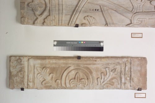 un sistema di solchi a sezione triangolare determina una serie di tre listelli al cui interno è ospitato l'apparato decorativo costituito da un clipeo centrale (lacunoso nella parte inferiore) definito da una coppia di cornice al cui interno è realizzato un giglio con scanalatura lungo i bordi. Dalla base del clipeo traggono origine due rametti rivolti verso gli angoli superiori e costituiti da foglioline binate e una lanceolata sommitale. Anche in questo caso la decorazione fitomorfa presenta scanalature lungo i bordi.