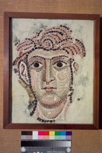 il lacerto musivo raffigura la testa di Cristo. La figura è in posizione frontale e rappresenta Cristo giovane e imberbe. Al di sotto delle ampie arcate sopraccigliari (costituite da tessere nere) i due grandi occhi sono segnati da due grosse pupille nere. Le gote e il mento sono rosa, mentre il resto dei tratti del volto è costituito da tessere bianche e verdastre. Il viso, le ampie orecchie e la capigliatura riccioluta sono contornati da grosse tessere nere. È sopravvissuto un piccolo dettaglio del fondo oro.