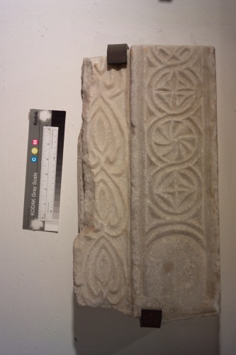 il pezzo è costituito da due sezioni di spessore diverso. La parte sinistra più sottile è percorsa da una serie ripetuta di foglie lanceolate concentriche. La parte destra è occupata invece da una sequenza di cerchi annodati formati da un nastro monosolcato. All'interno dei cerchi sono presenti una crocetta inserita in un rombo, un girale, un fiore a quattro petali e bottone centrale (tale da assumere la forma di croce) all'interno di un altro rombo. Inferiormente la serie è interrotta da una doppia cornice arcuata al di sotto della quale la superficie è liscia.