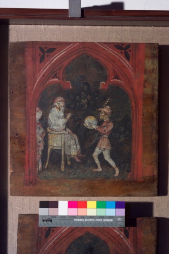 - NOTIZIE STORICO CRITICHE Le tavolette appartenevano forse ad una decorazione di soffitto (per una possibile provenienza da un palazzo della famiglia Meli cfr. Nepi Sciré) ben più complessa. La critica ha infatti rilevato stringenti collegamenti tra questo ciclo ed altre analoghe opere conservate all'Albertini di Vienna (cfr. Ragghianti) al Museo di Trento e al Museo di Cremona (cfr. Rasmo). A partire da Longhi il ciclo è attribuito dalla critica, pur con diverse puntualizzazioni circa la completa autografia e la datazione, a Bonifacio Bembo (per una disamina delle diverse posizioni critiche cfr. Nepi Sciré, con bibliografia precedente).
