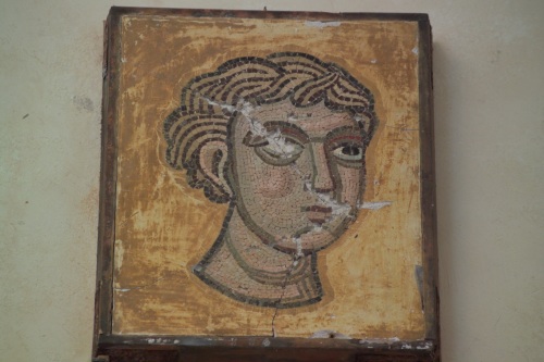 il frammento musivo raffigura la testa di un apostolo imberbe. Il volto tondeggiante, posto di tre quarti verso destra, è composto di tessere rosee, mentre altre tessere brune sono disposte attorno agli occhi (caratterizzati da grosse pupille nere di forma schiacciata) e lungo i contorni del viso. Le ciocche dei capelli mossi presentano striature brune e nere, mentre i il collo è delimitato da un pesante bordo di tessere nere.