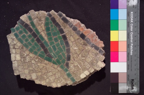 il lacerto raffigura un motivo fitomorfo di color verde con stelo centrale e una foglia allungata per lato. L'ombreggiatura è realizzata sulle foglie con una fila di tessere più scure. Su un bordo del frammento è presente un elemento illeggibile costituito da tessere rosate con contorno nero. Lo sfondo è beige (bianco in origine?).