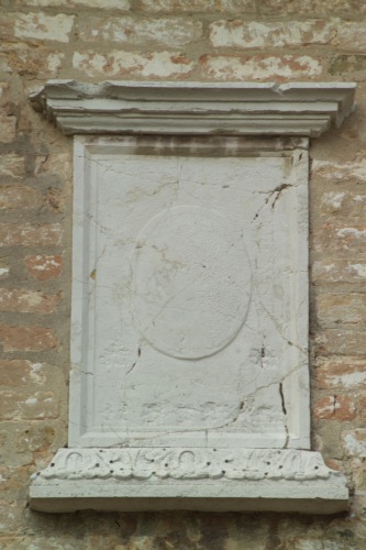 bassorilievo con scudo ovale incorniciato da cornice piatta. La lastra poggia su una base con foglie realizzate a trapano ed Ë sormontata da una cornice a formare una specie di edicola. Lo scudo si presenta liscio nella parte sinistra e bocciardato nella parte destra. Nello specchio esterno allo stemma si vedono appena tracce di lettere scalpellate.