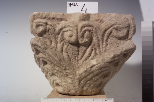 - NOTIZIE STORICO CRITICHE il pezzo presenta la tipica struttura del capitello cubico con corona di foglie alla base che però in questo esemplare è semplificata per la presenza di soli quattro elementi collocati in corrispondenza degli spigoli. Anche l'apparato decorativo superiore costituito da caulicoli appare notevolmente schematizzato e piuttosto rudimentale. Un capitello analogo è rintracciabile nel Museo Paleocristiano di Aquileia. Il capitello è stato riconsiderato e pubblicato da Agazzi (2018), che ha aggiunto ulteriori confronti e osservazioni: la resa delle foglie inferiori, apparentemente quattro elementi appuntiti, si rivela in realtà composta da mezze foglie accostate agli angoli, con effetti chiaroscurali geometrici. La zona cubica superiore accoglie volute estremamente sommarie, che lo distinguono per lavorazione e impaginazione da gruppi di reperti simili.