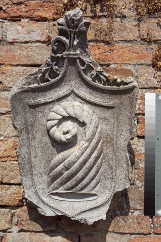 altorilievo raffigurante lo stemma della famiglia veneziana Tiepolo. Lo scudo è sormontato da un pennacchio e da foglie.
