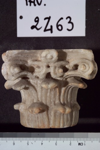 piccolo capitello corinzio classicheggiante con grande fiore a quattro petali sull'abaco. Le foglie sono disegnate con scanalature. La faccia superiore dell'abaco presenta incise le linee geometriche per la costruzione del capitello. Un foro del diametro di circa 7 mm attraversa in verticale tutto il capitello.