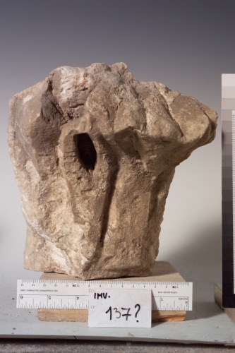 frammento di capitello corinzieggiante di cui resta leggibile solo una foglia avvolgente che doveva determinare con la sua sporgenza sommitale l'espansione del capitello.