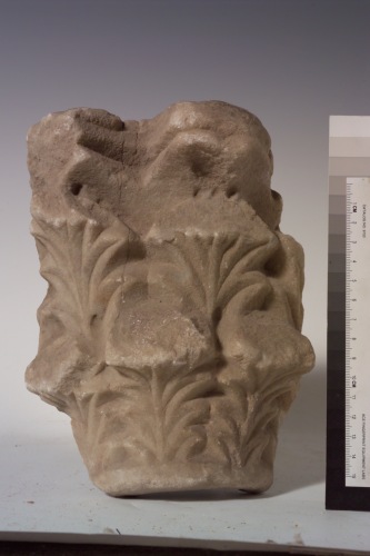 capitello in marmo frammentario corinzieggiante disposto su tre registri: nei primi due si allineano foglie a palmetta corinzieggianti tangenti tra loro. Le foglie hanno lobi appuntiti e definiti da un solco a sezione triangolare. Il terzo registro è occupato dagli elici convergenti a voluta. L'abaco ha sporgenze e rientranze.