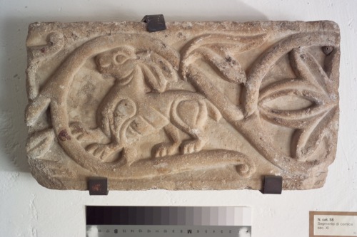 frammento di fregio marcapiano orizzontale decorato con motivo a tralcio abitato. Il tralcio è reso da un listello arrotondato con andamento sinusoidale e diramazione realizzata con una semplice incisione e desinenze a caulicolo e fogliette arrovesciate nei triangoli di risulta tra le due diramazioni del tralcio. I riempitivi fitomorfici e zoomorfici sono alternati: nel frammento sono rappresentati un leporide dalle membra a rilievo ed incise graficamente, ed una foglia palmata di cui sono presenti cinque lobi con nervatura centrale ottenuta dall'inclinazione dei piani, i due lobi sommitali convergono realizzando un occhiello.